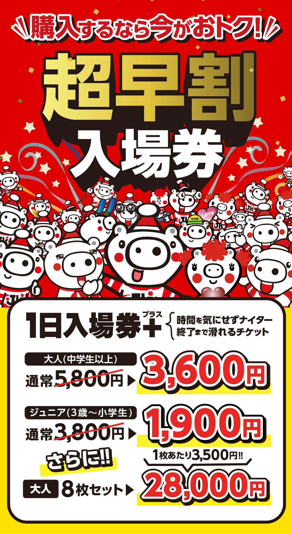 上国&岩原の入場券を買うならシーズン前の早割が断然おトク!時間を気にせずナイターまでたっぷり滑れる入場券+が、大人通常価格5,800円がなんと今なら3,600円!!ジュニア(3歳~小学生)の料金は、今なら1,900円で買えるチャンス♪
