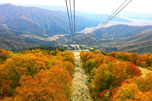 湯沢温泉街からわずか数分で山頂へ!世界最大級166人乗りの「湯沢高原ロープウェイ」に乗れば、紅葉に染まる山々を一望できます。山頂には高原の遊歩道や絶景テラスもあり、秋の空気を感じながらのんびり過ごせます。(ホテルから車で25分)