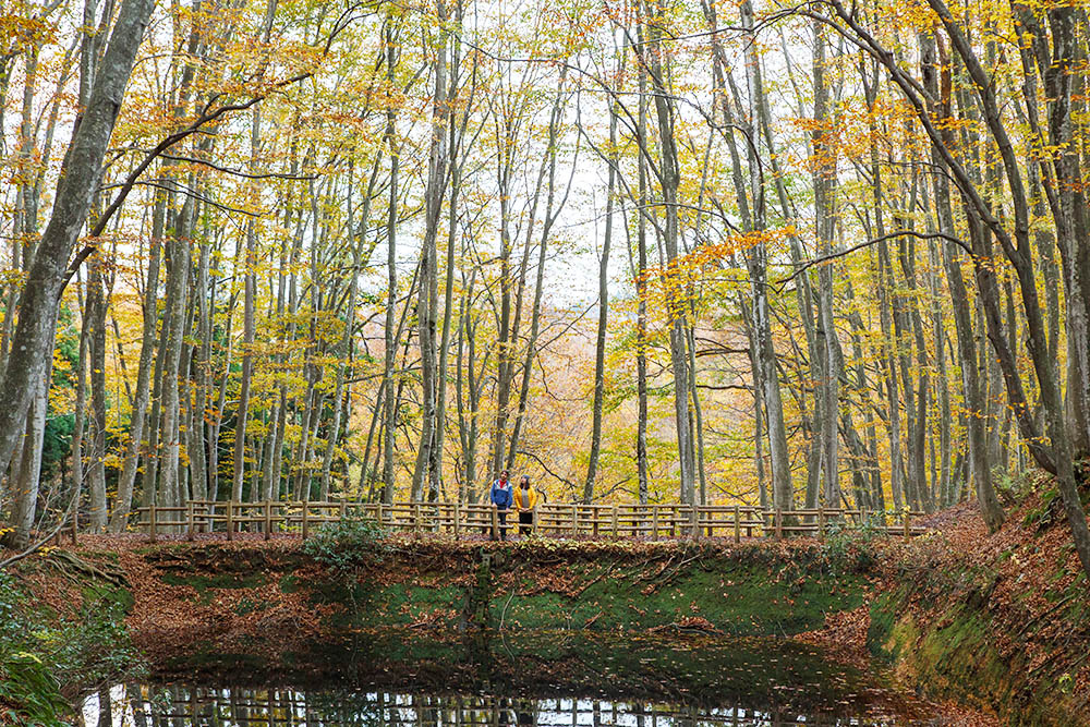十日町市松之山にある「美人林」は、すらりと伸びたブナの木々が生み出す幻想的な森。朝霧に包まれた光景はまるで絵画のようで、写真愛好家にも人気です。新緑や紅葉など、季節ごとに異なる美しさを楽しめます。(ホテルから車で50分)