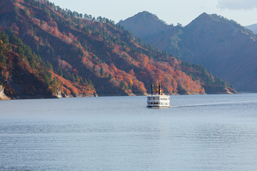 雄大な自然が広がる奥只見湖をめぐる遊覧船。四季折々の景色が楽しめますが、特に紅葉の時期は格別。山肌を染める紅葉が湖面に映り込み、まるで絵画のような美しさを堪能できます。(ホテルから車で1時間30分)