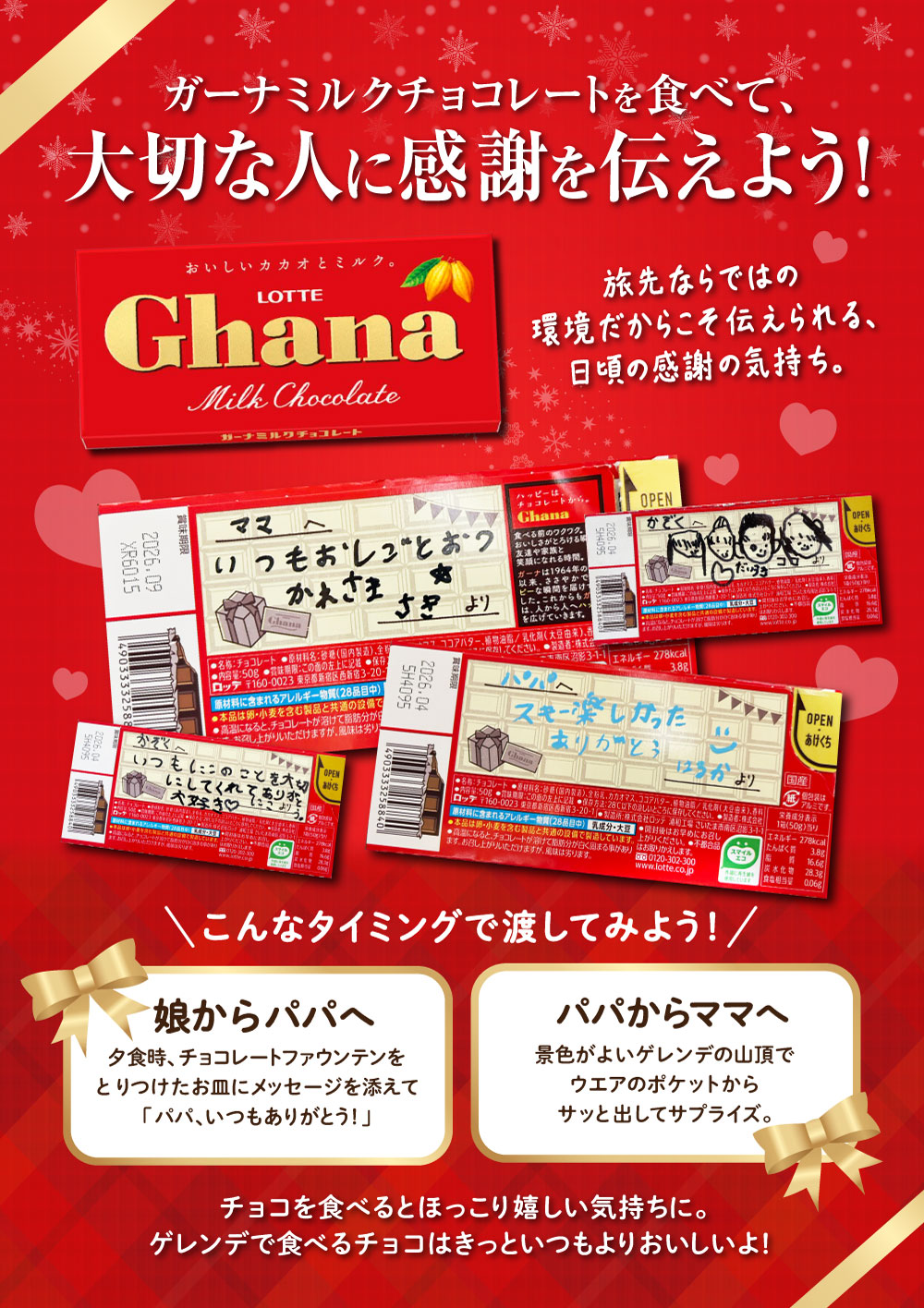 ガーナチョコを食べて、感謝の気持ちを伝えよう!非日常の旅先だからこそ、いつもは照れくさくて言えない「ありがとう」や「大好き」を、素直な気持ちで届けられるはず。ゲレンデで過ごす大切な人との時間に、ガーナの甘さをそえて、心に残るひとことを伝えてみませんか?
