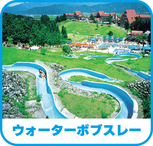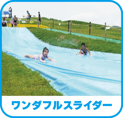 山の斜面をくねくねカーブしながら体ひとつで一気に滑りおりる水の滑り台!カラダを倒すとスピード感アップで思わず絶叫しちゃうかも!全長150mと100mの2コース。