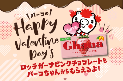 期間中、ホテルフロントやゲレンデで毎日先着枚数限定でロッテガーナピンクチョコレートをプレゼントいたします。ぜひパーコちゃんから感謝の気持ちを受け取ってくださいね♪