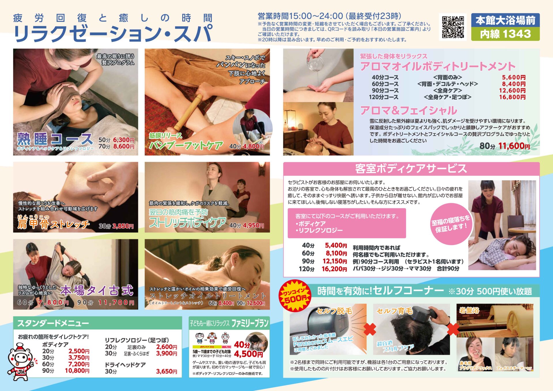 セラピストがお客様のお部屋にお伺いいたします。お泊りの客室で、心も身体も解放されて最高のひとときをお過ごしください。日々の疲れを癒して、そのままぐっすり快眠へ誘います。子供から目が離せない、館内が広いのでお部屋に来てほしい。後悔しない寝落ちがしたい。そんな方にオススメです。